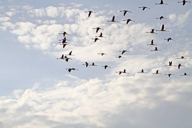 看到火烈鸟群中有灰色羽毛的火烈鸟,原以为是另外一种鸟类,查找资料发现它们是3岁以下的“雏鸟”。