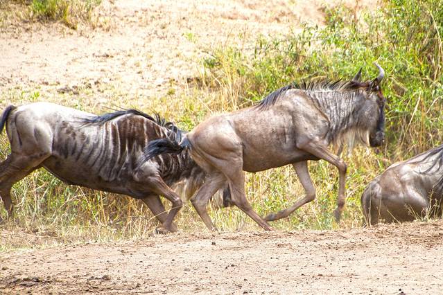 这时情况发生变化,在角马队列中间,出现分化,一些角马犹豫不决,徘徊不前,另外一些还往相反的方向跑。