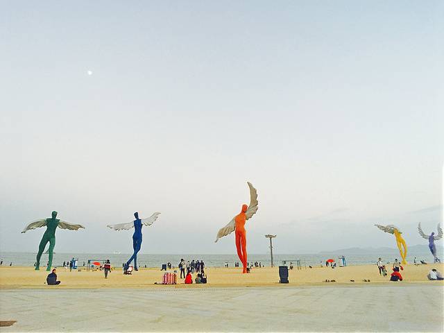 海滩上有彩色带翅膀的人像雕塑,非常具有标志性。