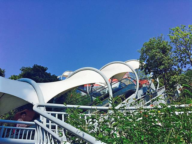 走过红色的玻璃桥后是一段长长的下山扶梯。