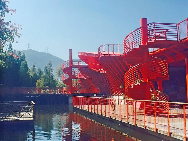 这组红色的廊桥造型大胆张扬,在这片湖光山色中奇异的很和谐。