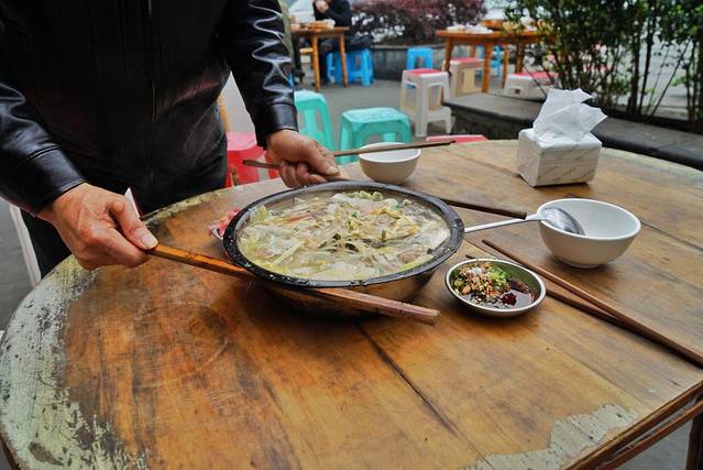 秘制的汤锅里,加上白肉、酥肉、肉丸、粉丝、豆皮等等,可以根据个人喜好随意添加。等了一会儿,热乎乎的汤锅就上桌了。同时,会附赠四川必备的泡菜和蘸碟。