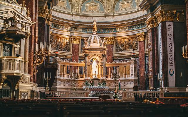 教堂的石柱交错的排开,石柱上满是残殇的纹路痕迹,华丽的灯光洒在那些精致的木雕装饰上,整个教堂犹如珍藏着久远历史的博物馆。