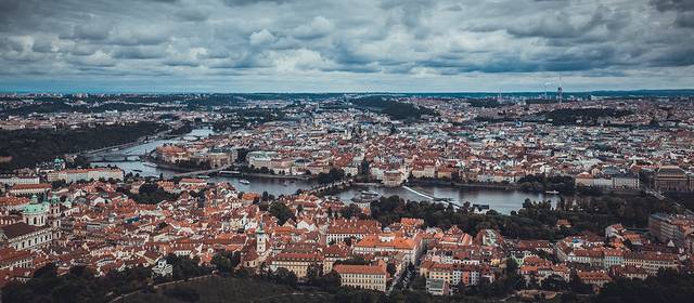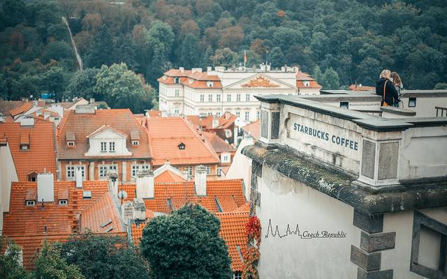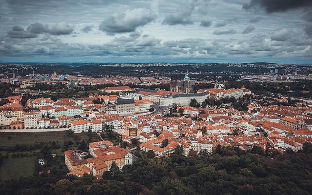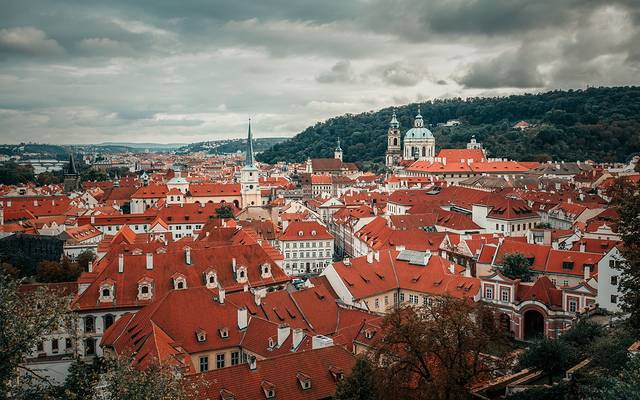 当把所有的阶梯走完,就是一片公共的免费观景台,而整个布拉格就在你眼前。圣尼古拉斯教堂绿色的穹顶在一片红中尤为醒目,如果此时正值阳光普照,一定又会耗去我不少快门。