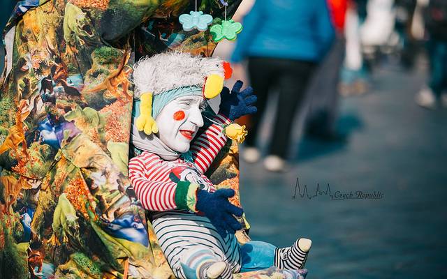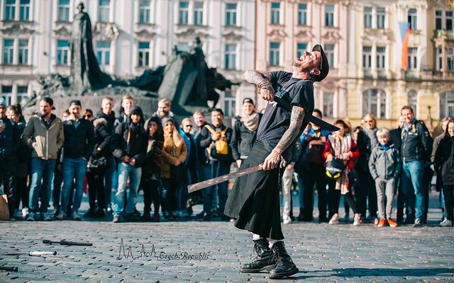 全场的焦点要数这位穿着裙子的刺青小哥,手扛各种武器,看起来有十八般武艺待施展,在我满怀期待的看了十分钟才意识到,原来这位小哥并不会什么特技,却是一个戏很足的搞怪大师,惹得众人捧腹大笑,最后的小费自然也是给的心甘情愿。据说这位小哥长期驻扎在这里,至少我去了几次都有看到他的身影,如果你也去布拉格,不要忘了去看他耍宝。