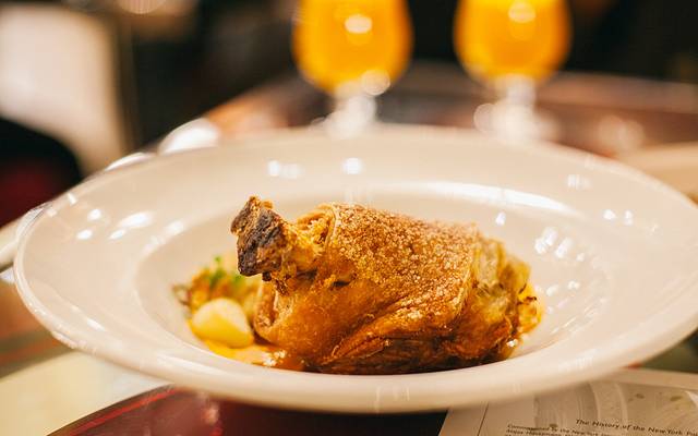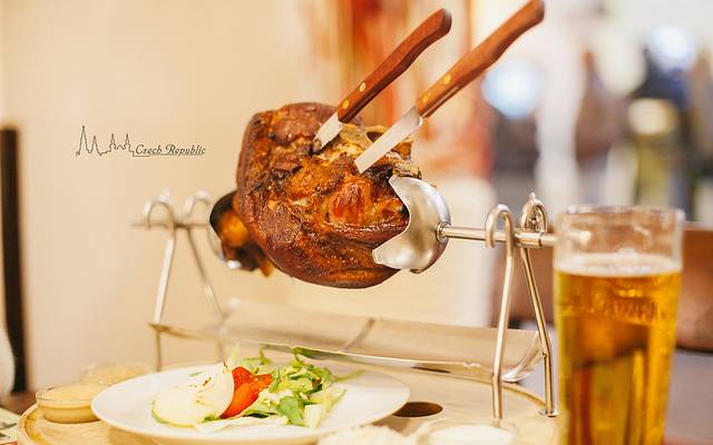 相比中欧的其它几国,捷克的食物绝对不能算黑暗料理,甚至还能觅到不少美味。谁说猪蹄是德国人的专属,捷克人烹饪猪蹄的水平也不赖,在我看来,甚至要超越德国猪蹄。位于老城广场附近的Mustek Restaurant可以吃到最地道的捷克猪蹄,因为没有提前定位,到的时候站门口等了半个小时,为了打发无聊的等待时间,店家会让乔装成屠夫的服务生手拿一把玩具刀站在门口和我们互动,虽然全程都在陪他假嗨,但这么一来二去的,半小时倒也不显得漫长了。这家的招牌是猪蹄和鹿排,对于鸡鸭牛猪以外的肉,我们不太能接受,所以选了猪蹄,不得不说这家的蹄髈非常香嫩入味,分量十足,这让自称无肉不欢的我们浴血奋战一小时都只解决了一半。看了下邻桌,4人也就点这么一份猪蹄...