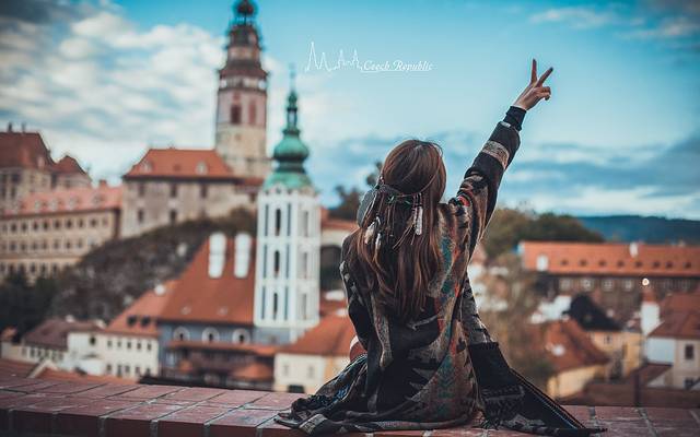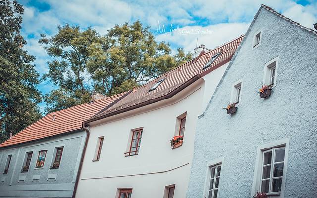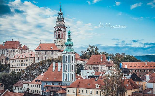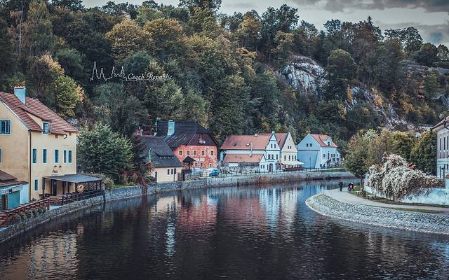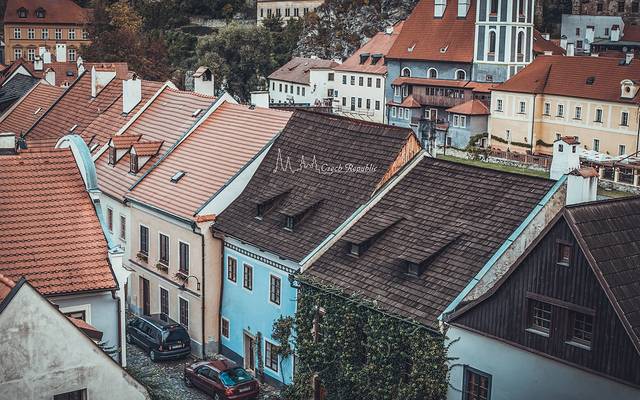 从布拉格慢慢悠悠的开车来到这里已是下午,虽然不见阳光,但至少天空是蓝色的。蓝天与白云,搭配着小镇的红顶房屋,它们沿着河畔连成了一片,又被蜿蜒的伏尔塔瓦河划成了两个世界。