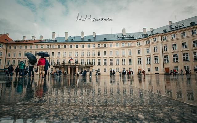 布拉格城堡曾经是捷克王室所在地,现在则是总统与国家机关所在地,城堡前重兵把守,在这样的雨天显得特别庄重。记得在天文钟上,我已经被这座城堡的外形深深震撼,虽说我看过的城堡不计其数,但规模如此之大的城堡还是第一次见,后来才得知,原来布拉格城堡是全世界现存的最大的城堡。城堡里最主要的三个景点分别是圣维特大教堂、黄金巷和旧皇宫,其中两个都是室内景点,所以下雨天来此参观可以算是比较明智的选择。