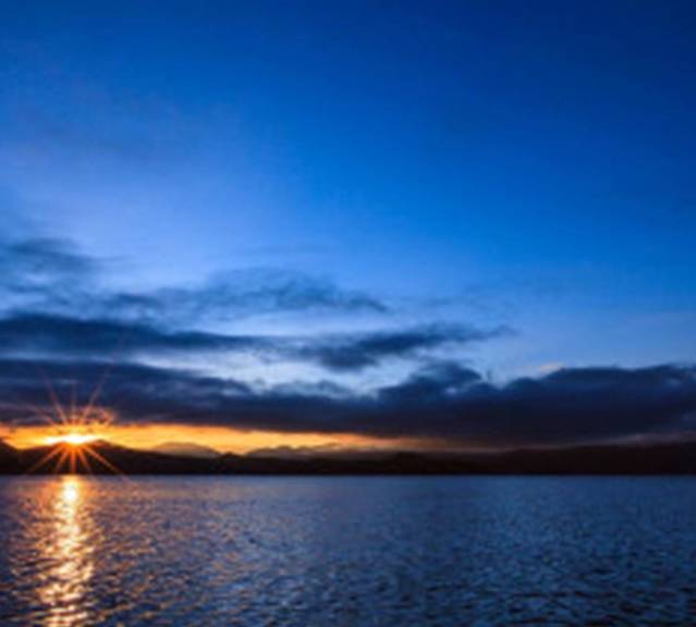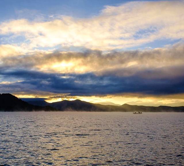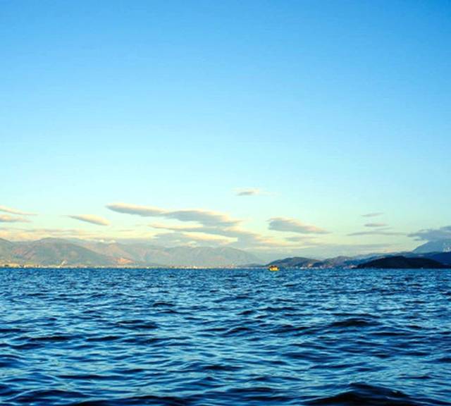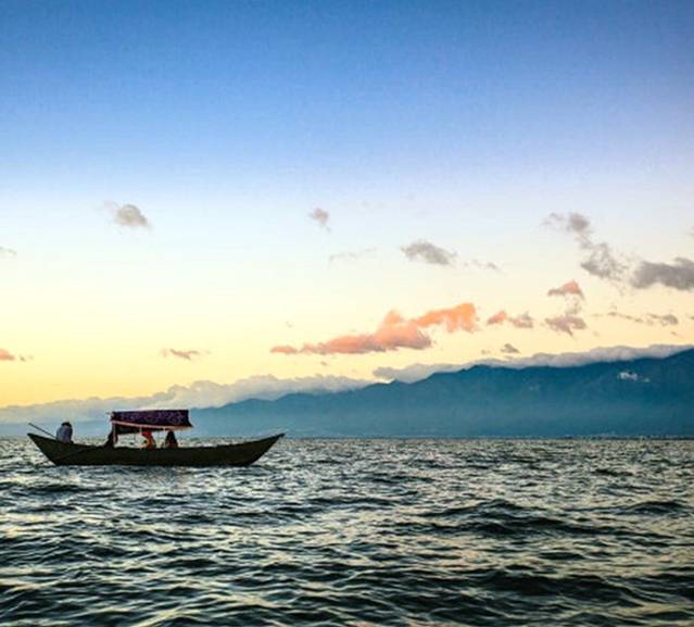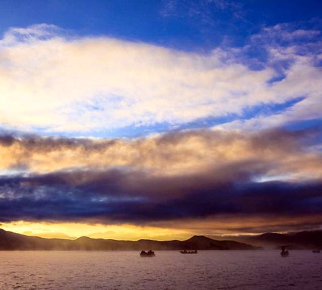 天已经有些微亮了,细细碎碎的湖面宁静而繁忙,天空的流云由深渐渐转亮,光线一缕一缕的挣脱云层和山丘的阻挡,执拗、猛烈,疯狂的照亮一拨拨水面,金色的晨光在波光粼粼的湖面上渐渐荡漾开来。太阳已经露出红红的半个球了,周边的云层已被染成了黄色。东南方向山坡上的小楼也被照的亮亮的,晨曦中反射出金黄的光芒。慢慢的,太阳露出了整个头,里山丘越来越高,整个湖面都被照亮了。此刻才注意到日出时分的湖面,三三两两的小渔船已经出发作业,湖面笼罩在一片朦朦胧胧的晨雾中,晨雾随风快速的游走在湖面,而渔船像是游走在雾气的仙境里。一瞬间,世界像是重生了。大家伙再也抑制不住心中的激动,观赏的人群沸腾了。船工也开始陆陆续续发动马达,开起小船,准备返回里格。一阵阵白白的雾气随风扫过湖面,轻浮过我们的船身,掀起了游人的衣襟,此刻,我们也正随木船游荡在仙境里。