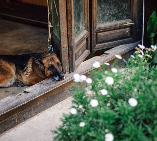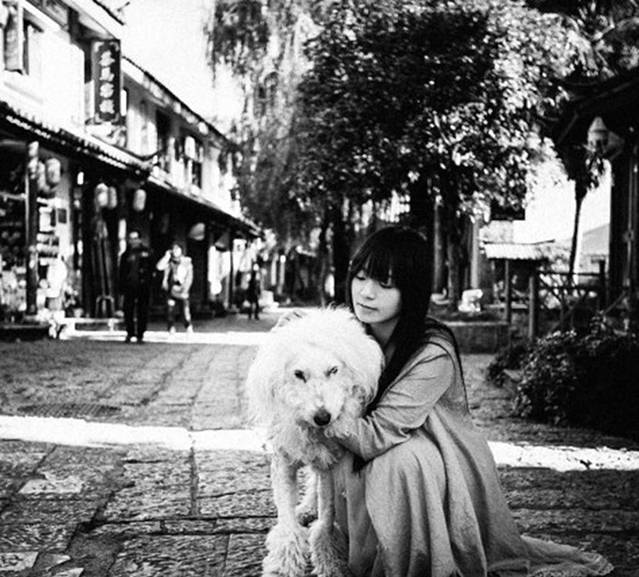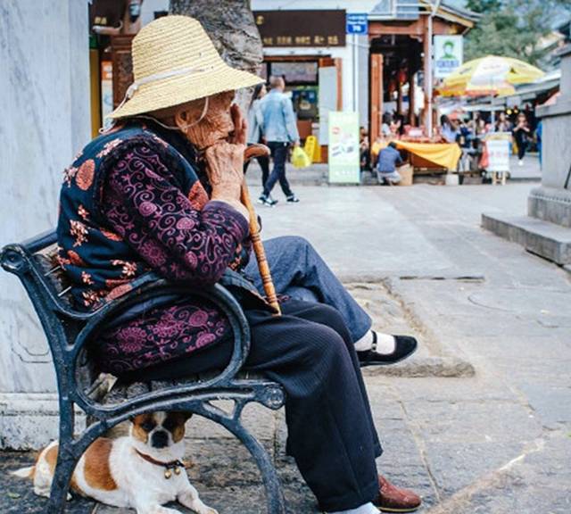 街头小憩的老人和她的狗狗。