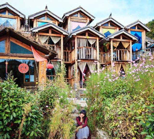 湖边一家富有浪漫主义情调的客栈,门前的小花园格桑花一人多高,开得正好。