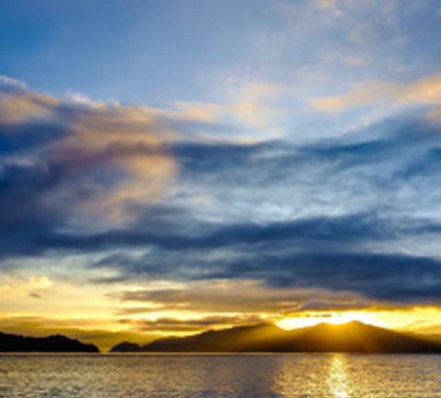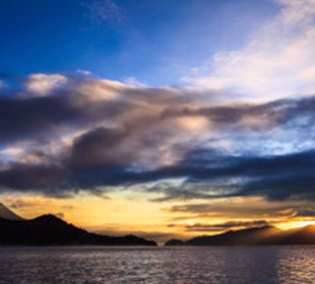 光线染红了云层和湖面。