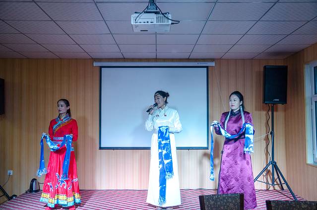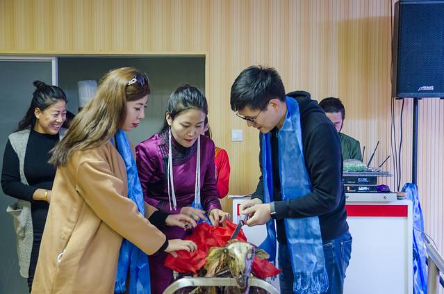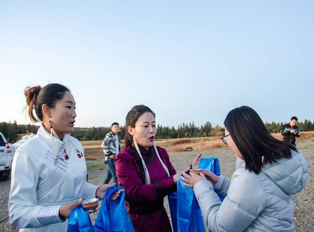来到内蒙,你能体会到从未感受到的热情与仪式感,犹记得去年冬天那达慕大会上,聊了两句的当地人便热情的拉我去他家吃饭,零下二十几度的严寒也阻挡不了的热情。当车到达度假村门口,好看的蒙古女子献上蓝色的哈达,并为客人倒满马奶酒,这也就是所谓的“下马酒”。从接过马奶酒到喝完,并不是随意而为,都是有矩可循的。双手接过酒碗,无名指沾酒向上弹示意敬天,无名指沾酒向下弹示意敬地,无名指沾酒点额头示意敬祖宗,最后一饮而尽。