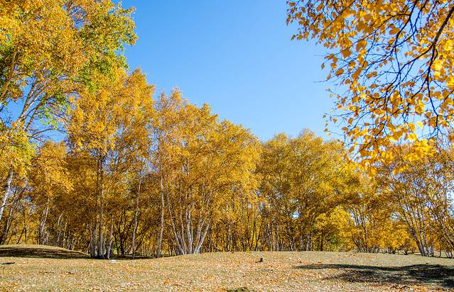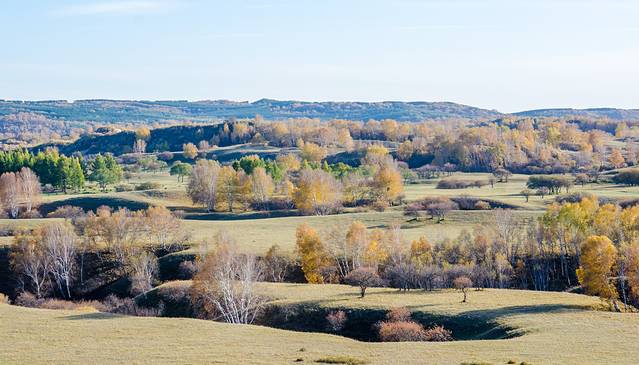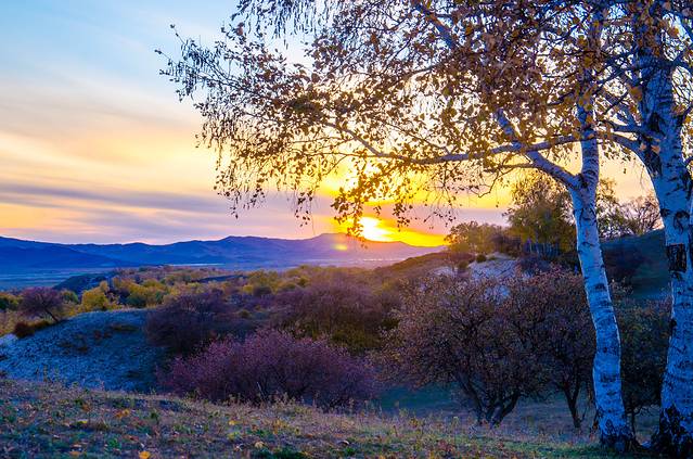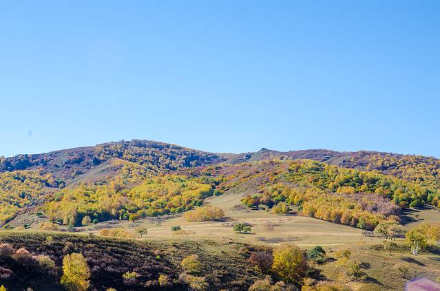五彩斑斓的画面,由于微霜冻的作用,草原上不同的树种因抗寒能力不同而呈现出不同的颜色,就像是披上了节日的盛装,松的绿、柞的红、杏的紫、桦、杨的黄、白……赤澄黄绿青兰紫百色争艳,姹紫蔫红,真是“万山红遍,层林尽染”