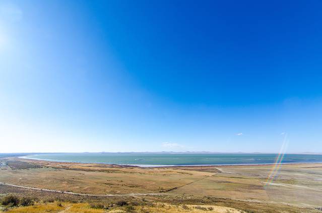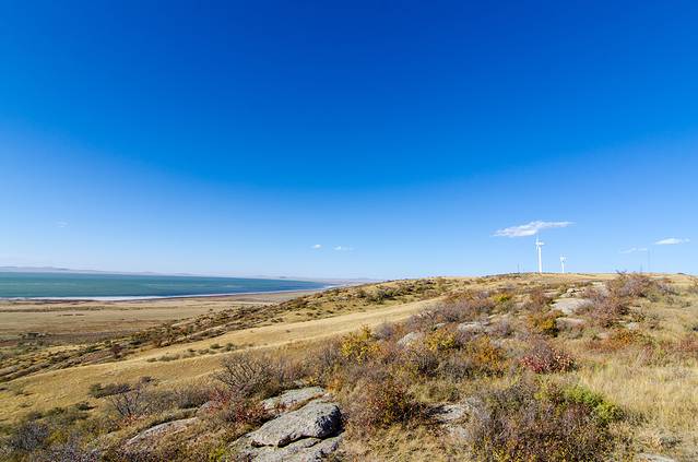 达里诺尔湖,用“落霞与孤鹜齐飞,秋水共长天一色”形容最为贴切。乘坐景交车来到南岸的曼陀山,刺骨的寒风阵阵,但却丝毫不影响这里美的壮观。蔚蓝的天空,碧绿的湖面,湖面辽阔如海一般。