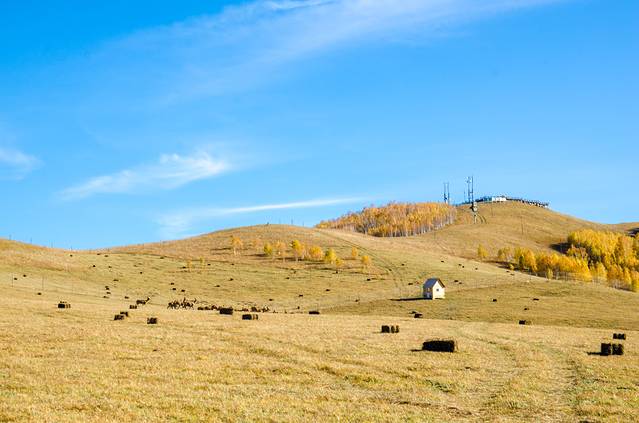 赤峰的秋来的早,也去的早,从伊始到结束也不过短短十天左右,十天后,这里便进入漫长而又寒冷的冬季。草色渐黄,牧民们便开始打草,用机器将收割的草弄成草垛,这些草垛是冬天牲畜的口粮。于是就出现了这样的画面,辽阔的草原上,一个个草垛由近及远,将人们的目光牵引向远方。