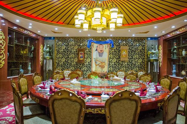 来到内蒙,体验蒙族生活从一顿地道的蒙式早餐开始,来到经棚镇一家非常正宗的蒙餐餐厅,餐厅的装饰特色十足,包厢内悬挂的成吉思汗画像、两旁摆放的苏鲁锭长枪,橱窗里展示着各色各样的蒙族装饰品。