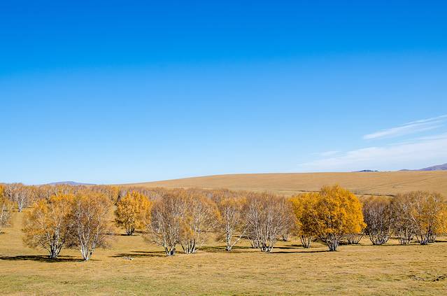 乌兰布统野生动物园,拥着蓝天白云,携着黄色和风,人们可以领略恬静、秀美的草原景色,来到草原深处,一大群梅花鹿在悠闲地吃草。望着渐渐靠近的人群,它们忽然向不远处的白桦林奔去。
