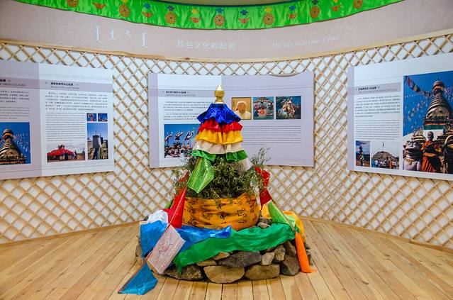 来到场馆的二楼,二楼主要介绍了敖包的相关知识,敖包是蒙古语汉译为“堆子”。敖包原是指在游牧交界之处及道路上用石块或泥土堆积起来以作标记的石堆或土堆。后来逐渐被视为神灵的居所,被作为崇拜物加以祭祀和供奉。祭敖包是蒙古民族萨满教隆重的祭祀之一,也是蒙古族最为隆重热烈而又普遍的祭祀活动,每年的农历5月12、13日是牧民的祭敖包日。