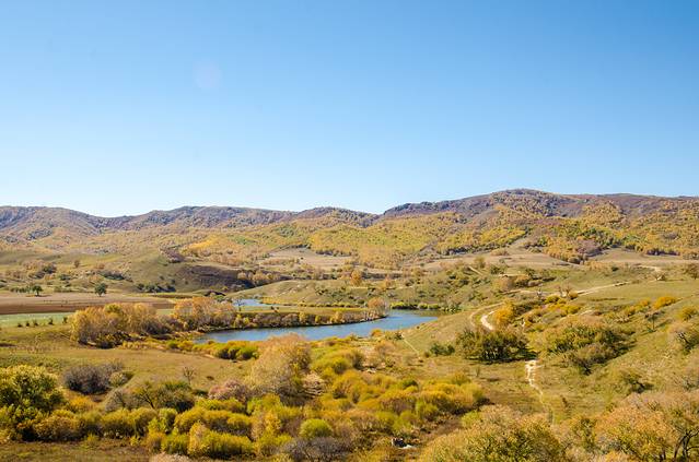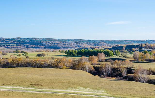 曼陀山,位于达里诺尔湖的南岸,曼陀山上的风光又非常独特,靠近湖的一侧是草原,草原上的草长得格外茂盛,背靠湖的一侧则是色彩斑斓的灌木丛,灌木丛从山坡上一直延伸到远处,山脚下灌木丛环绕的是一个小镇。