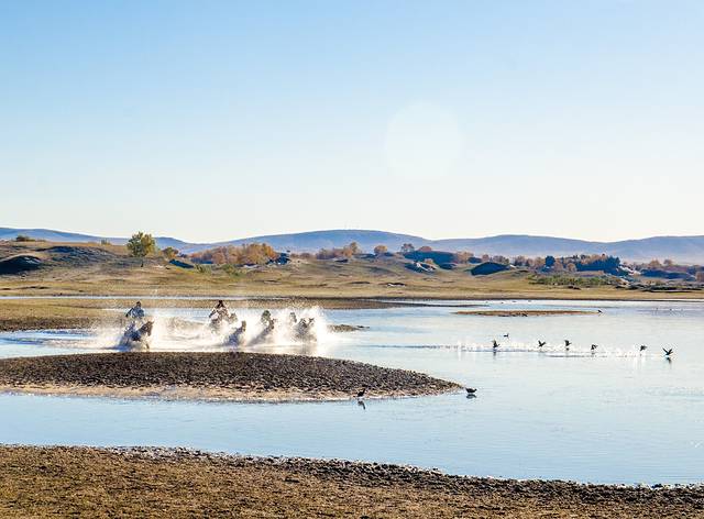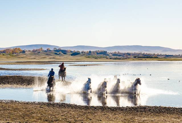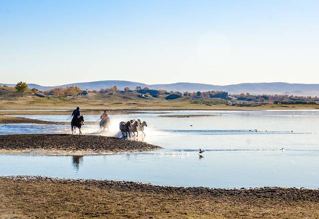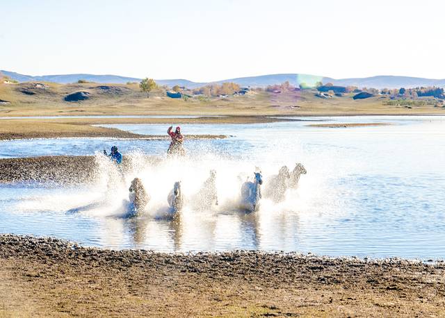 马踏水花,一个别处不多见的表演。每天清晨时分,将军泡子这广阔的湖面上都会有马踏水花表演,在牧马人的驱赶下,一群白色的骏马在湖面上策马奔腾,马蹄踏起的水花在晨光的照耀下熠熠生辉。