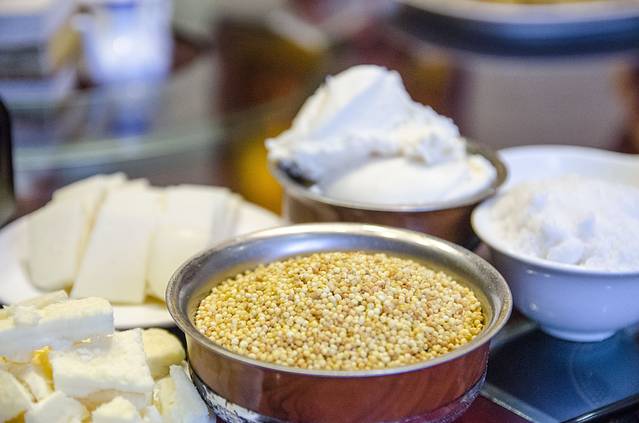 炒米,蒙语叫做“蒙古勒巴达”,就是蒙古米的意思。它是用糜子经过蒸、炒、碾等多道工序加工而成的,再对上酸奶和白糖等搅拌,解饿又解渴,清香爽口,是别具风味的传统食品。炒米是大多数牧民的早饭,再配上加入酥油和少许青盐的奶茶。牧民外出放牧,都随身携带一小袋炒米。到了中午,煮好奶茶,泡上炒米,边吃边喝,十分方便。