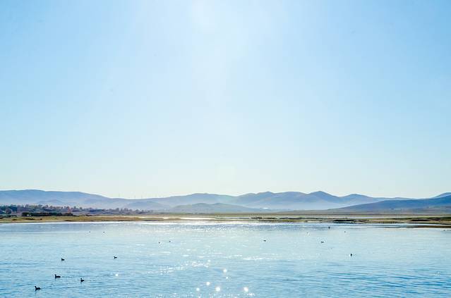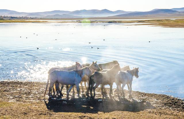 乌兰布统的清晨,呼吸着草原的清新空气,观湖面晨光,看阳光把眼前的一切都染成金色。远处的山峦萦绕在雾间,刚刚表演马踏水花的马身上热气环绕,湖面的波光粼粼,倒映着一只又一只的水鸭·····