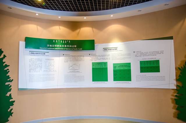 往场馆里面走,又了解到沙地云杉的生长条件和过程。沙地云杉,俗称“白杄”,从科属来说,它是松科,云杉属,常绿乔木。此树极耐寒冷和干旱,既能调节气候、净化环境,又能防风固沙、保护草原。沙地云杉不仅创造了沙漠生命的奇迹,还以其不畏严寒、傲然挺拔的雄姿赢得了人们的青睐。