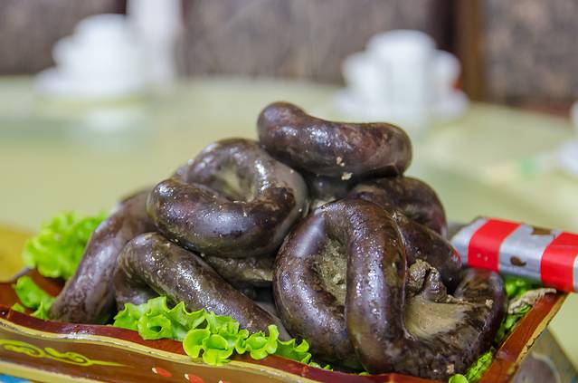血肠,将盐、葱末、少量的水和面粉放入羊血中,调成血浆。用羊肺从羊肠一头清洗三四遍,洗净后,将血浆灌入羊肠,边灌边用手搓匀,上锅煮熟,拌沙葱、韭菜花等即可食用。血肠一般有蒙餐的饭店都有卖。