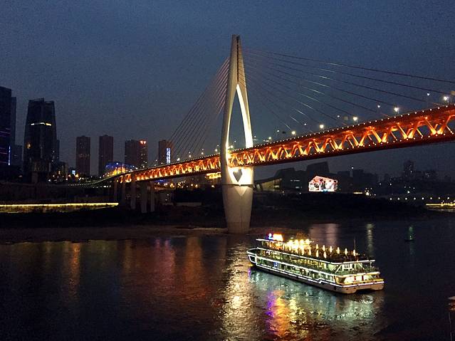 洪崖洞位于重庆市沧白路、长江、嘉陵江两江交汇的滨江地带,以巴渝传统建筑特色的“吊脚楼”风貌为主体,依山就势,沿江而建,一层是地面,三层也是地面,九层还是地面,建筑依山而建节次鳞比分外好看,特别是它的夜景炫丽无比,为了等洪崖洞的夜景,我在洪崖洞上上下下走了好几个回合,等啊等........天黑了,灯亮了,你看!千厮门大桥,嘉陵江中的游船,洪崖洞的灯光—— 好炫啊!