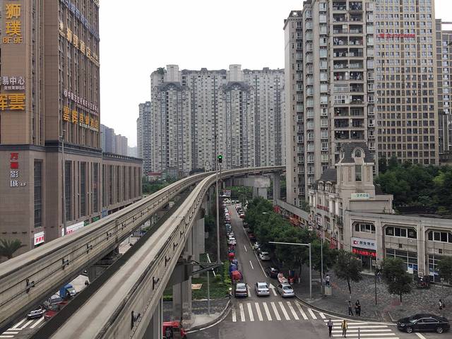 重庆给我的第一印象就是马路上好清静呦!宽宽的马路除了少量的行人(当然有人行道了)就是汽车,没有其他城市所有的电动车、自行车,一下子就显的马路上很规矩,行人过马路也不担心会有电动车冲过来。抬头看!高高的高架桥上行走的是轻轨。
