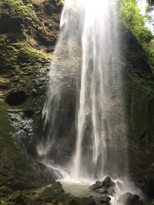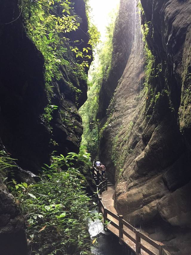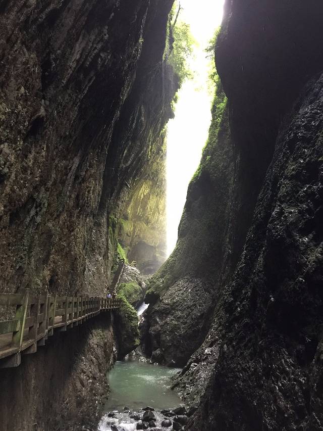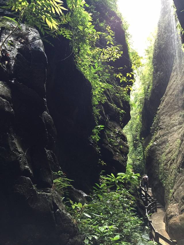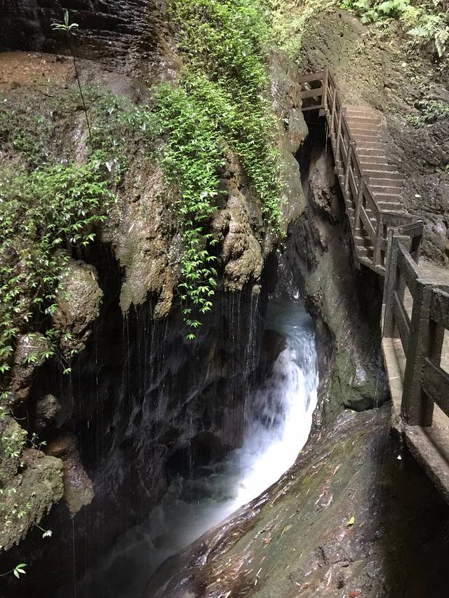 地缝狭长而幽静,沿石壁修建的栈道百转千回,每转一个弯都有不同的景色呈现在眼前,身旁石壁直立,脚下溪水湍急,不时头上有小小瀑布落下,让人玄秘而惊奇,到了一个巨大的瀑布跟前巨大的轰鸣声震耳欲聋,叫什么名字就是想不起来了。
