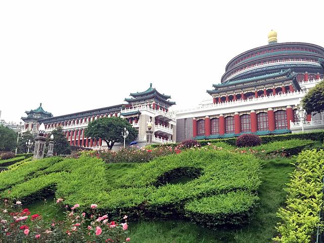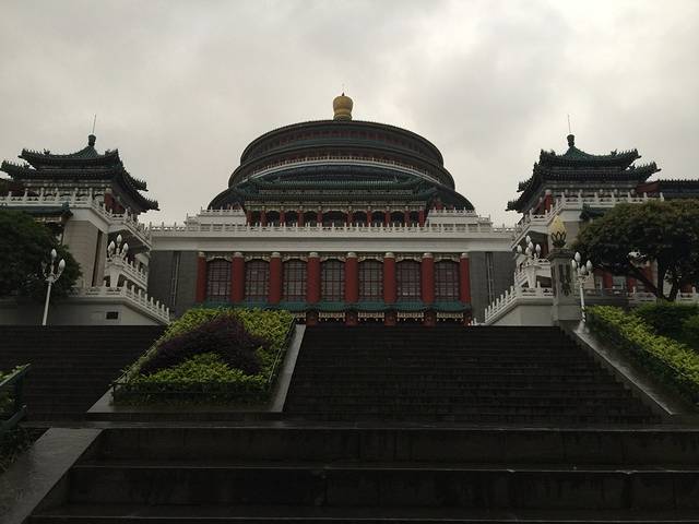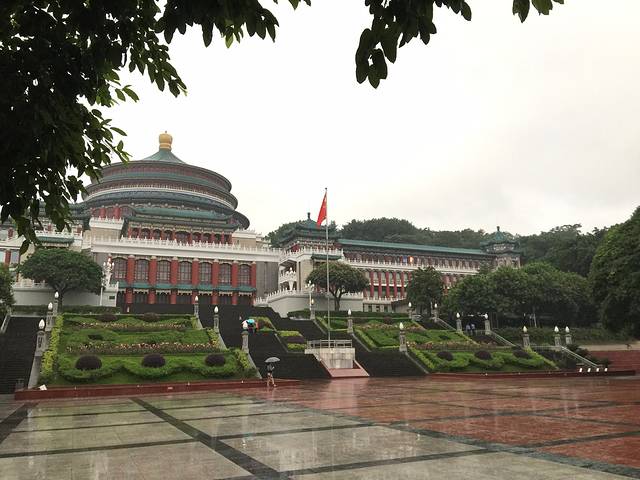 嘿!好美的建筑呦,这就是重庆的人民大礼堂,外形有些像北京的天坛,大礼堂建在坡上,下台阶是一条路,过了路再下台阶就是一个大广场,叫人民广场,广场上还有两棵巨大的榕树,与之大礼堂相对应的是“三峡博物馆”。