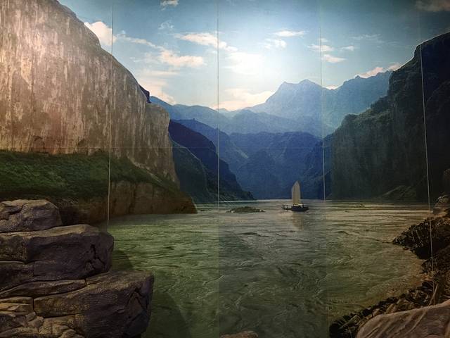 三峡博物馆就在人民大礼堂的对面,免票参观,进去看了一个“重庆大轰炸“的电影,还看了一个“三峡”的环形电影。博物馆内很大,有重庆的过去,三峡建设的移民和建设,还有书画展。