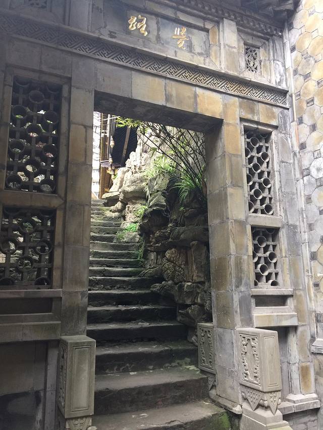 车子向前开动,乘客就我一个,走不远下坡往回走,眼看着湖广会馆在山坡上,路经一个大牌坊《湖广会馆》,有人在那里拍照,这里可能是大门,要拾阶而上才能到达会馆,重庆的路就是这样,你以为是地面,其实是在半山腰。