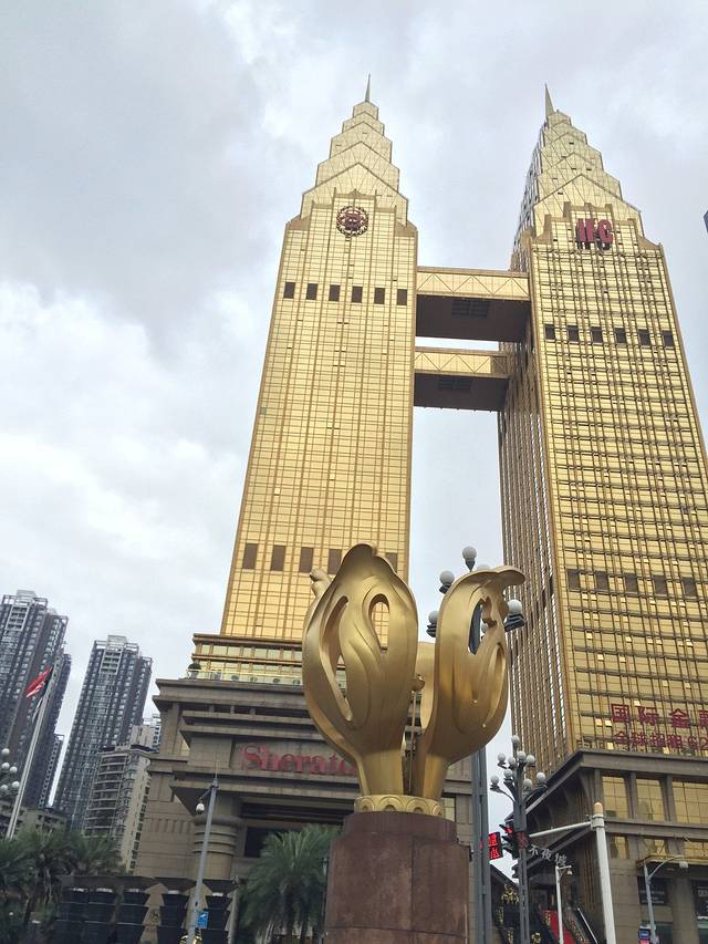 这个黄色的高大的建筑就是喜来登酒店,很抢眼!,在它的路对面就是一个开阔的广场,广场下就是滚滚长江。