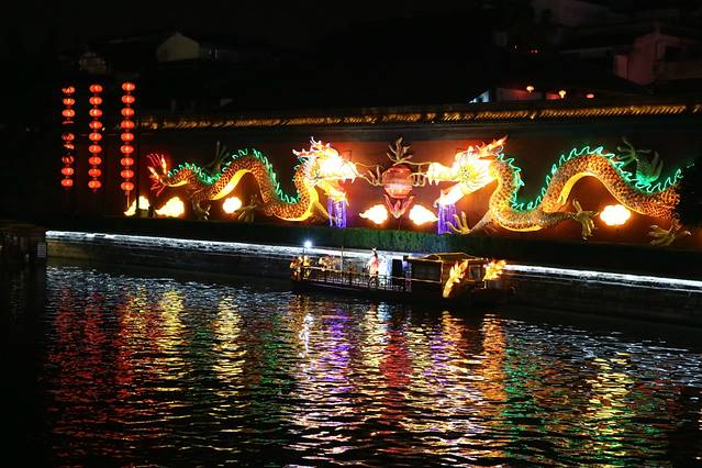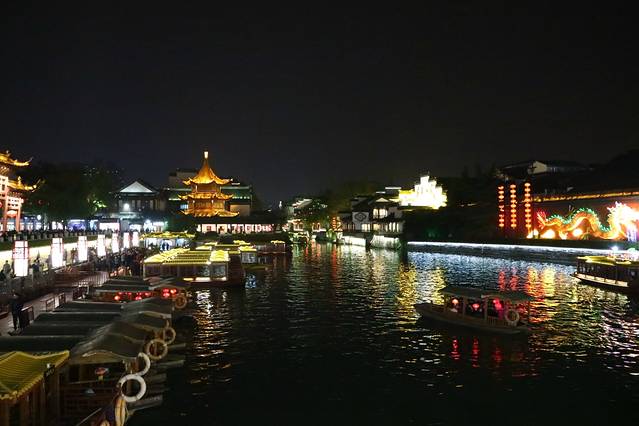 秦淮夜景,河对岸不时有船只会停下来,打开船只灯光就开始表演唱曲,唱完关灯就游开,过段时间,音乐又响起,灯光打开,又表演起来,不确定是否其实就是同一首表演船,岸边有些大叔很认真的观看,还跟着唱起来,整一环境很是热闹新奇,灯光效果的确很美。