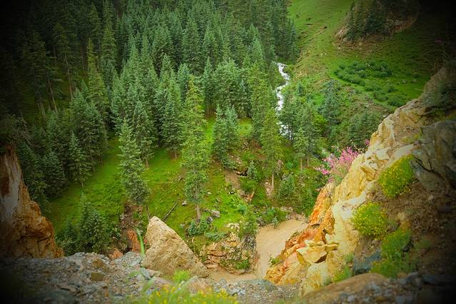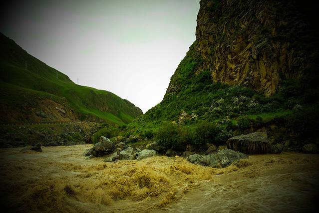 一定要行驶到U型大峡谷处,然后爬上石头去看,非常惊险刺激,几乎是垂直的岩壁,底下是湍湍激流,U型大峡谷最显著的特征是八宝河和黑河汇集之处,图中可见清流和黄水汇流,这里就是U型大峡谷处,地势险要,河水湍急,站在上面腿有点软。