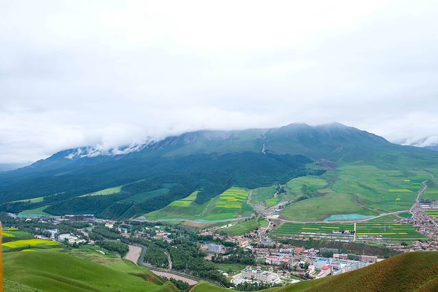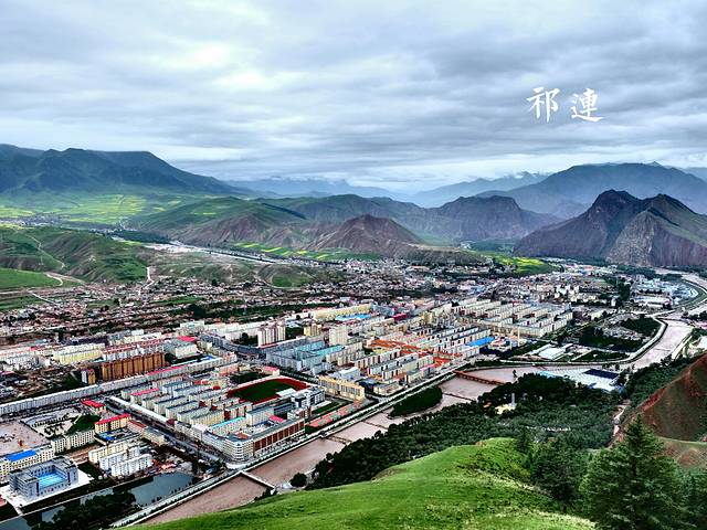 从卓尔山上拍县城,被众山包围,依河道而建的祁连,从山上看紧密集中,颜色亮丽。