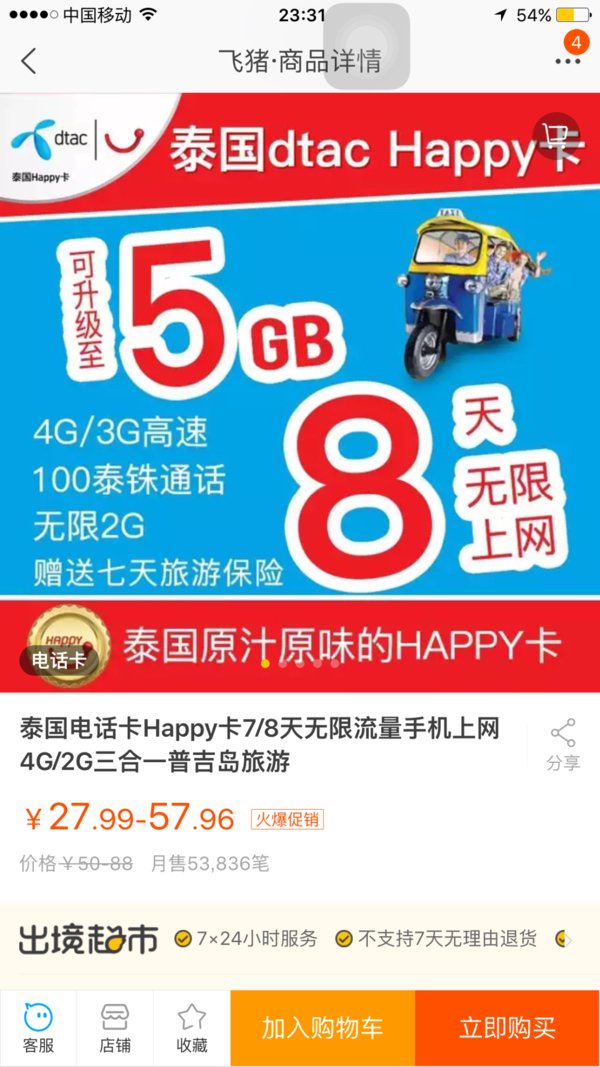 ☎️对比后选择了泰国HAPPY卡7天无限流量。 直接某宝买的,30多元。当地711也有,60人民币还经常断货,所以还是国内买好比较稳妥。用后感想,流量根本用不完,电话也没打几个,速度也足够了,性价比很高!