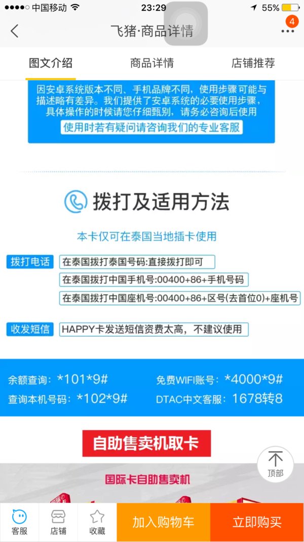 购买时一定咨询客服您的手机型号是否匹配,收到货后在国内千万不要拆开试用,我是到曼谷转机时把卡换上的。附送了地图和取卡针,不用剪卡,三卡合一的,插卡后开机即可,会短信告知手机号。给国内打电话时一定拨打00400+86+区号(第一个0去掉)+座机电话。(这个最便宜)