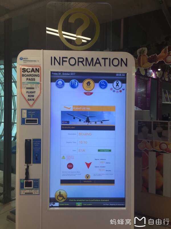 我们在曼谷转机,根据指示牌走,路上发现⬆️机器,左下角红外线扫描一下下一段航班机票上的条形码,出现信息栏,告知下一航班的登机口,直接奔向登机口即可。