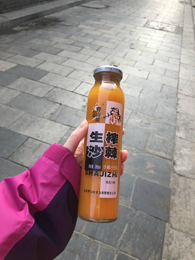 沙棘汁,酸甜的,在北大街卖10元3瓶,到东大街那边就卖10元4瓶了。沙棘是当地特色水果,或者是浆果吧。