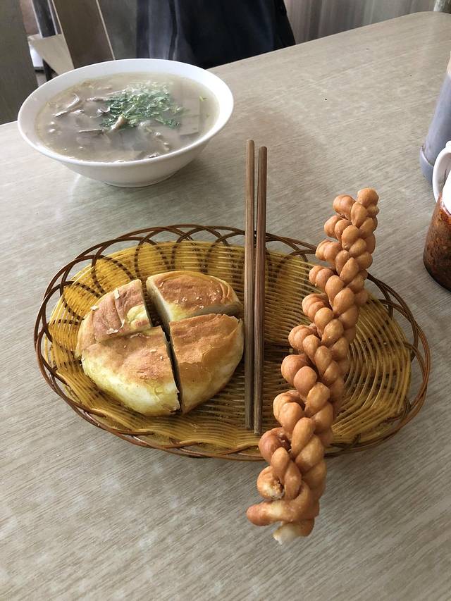 从晋祠出来坐公交到山西省博物馆已经是中午了,山西省博物馆周围没有什么可吃的,只在附近看到一个羊汤馆,进去喝了一碗羊肉汤。这个汤和早上的不太一样,早上是清汤,这个汤里加了胡椒粉,更好吃了,汤里只有肉和粉丝,又买了酥油饼和麻花,酥油饼泡在汤里味道特别好,既有酥油的香味,又有肉的味道。小碗羊汤12元,麻花1元,酥油饼2元。