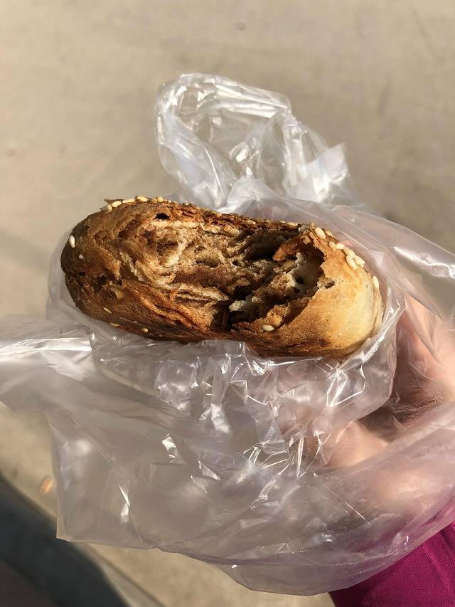 麻酱烧饼,这是我这一路上觉得最好吃的食物,即使现在还唇齿留香。烧饼是现烤的,外酥内嫩,热乎的烧饼放嘴里一咬用舌头一抿就化开了,芝麻酱的香气充满整个口腔。虽然在北京也吃过麻酱烧饼,但是跟这个比真是差远了,当然现烤现吃是最好的。