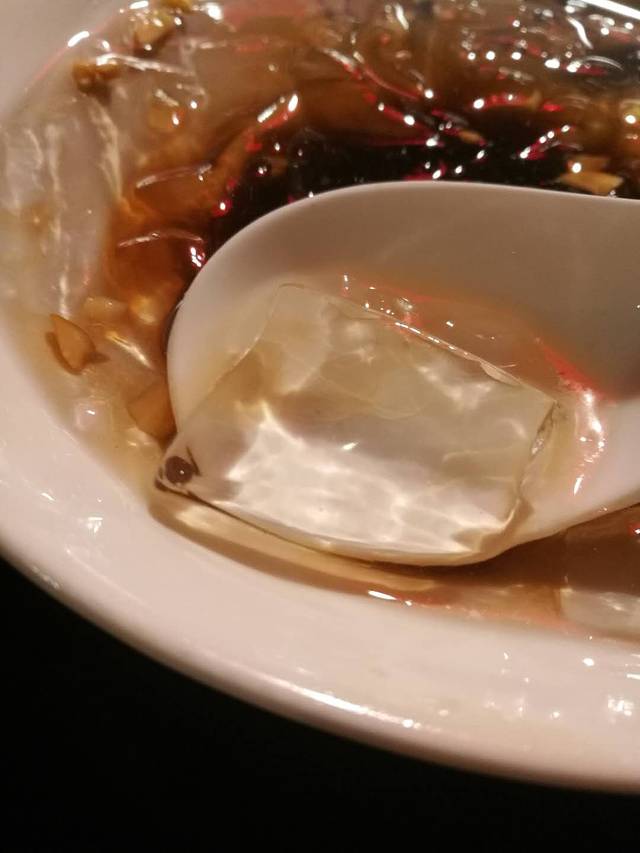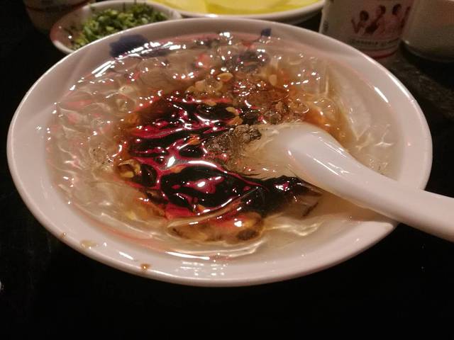这家店的冰粉也是一绝,我尝了她推荐的酸梅冰粉,晶莹剔透,透明的冰粉被浇上红糖和碎花生米等辅料之后,口感清爽,酸梅的清香、冰粉的清凉和花生米的脆香完美结合,既解辣,又开胃。