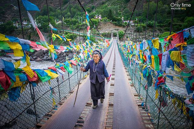 吊桥上远远的就看见这位婆婆,一手拄着拐棍,一手握着香,颤颤巍巍的走过,不知道她这是要去哪里祭奠。