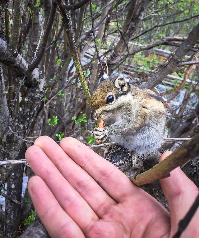 我发现它时,它在路边的树上蹿来跳去,然后站在一个高枝上认真的看着我,我掏出早已准备好的花生伸向它,它似乎心领神会一样,嗖嗖的就窜到我的面前,在我的手边打量了一番,感觉我并不是“危险份子”,就爬到我的手上抓走花生,香甜的吃起来。