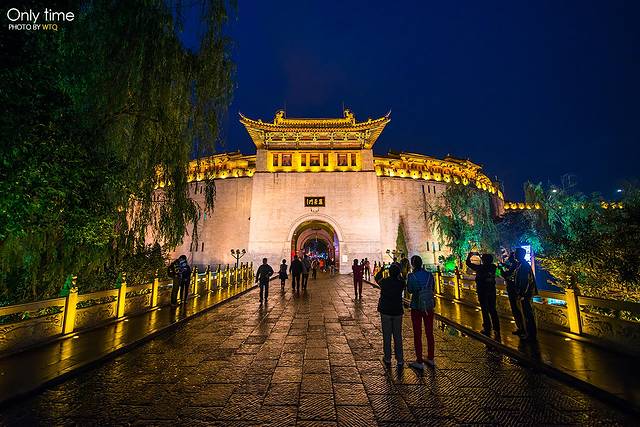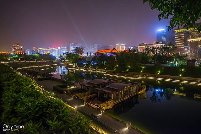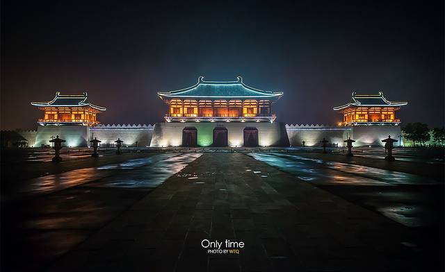 网上看到过水中美丽的定鼎门倒影,来到这里时已经接近22点,广场上空旷无人,装扮城门的彩灯映射着空气中的水气,蓝色、紫色、黄色,朦朦胧胧的,一种梦幻般的感觉。
