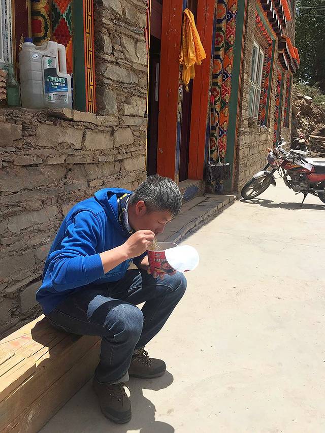 大盖乡里一个寺庙开设的小超市,点了两碗方便面算是我们的午餐吧。坐在门口的木墩上,吃着泡面看着卡瓦洛日雪山(老乡告诉我的名称)。